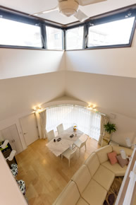 3階ホールから見下ろしたLDK。天井近くの窓から明るい光が室内に降り注ぐ