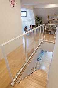 最もこだわったのは、2階のLDKの明るさと開放感です。リフォーム前は、吹き抜けはあったものの、光がうまく室内に行きわたらず暗くて狭い印象でした。村木さんからの提案は、階段室を取り込んで広さを確保するとともに、吹き抜けの片側にある壁を取り払い、LDKと3階のホールをつなげるプラン。3階ホールには透明ガラスの手すり壁を配し、さらにリビング階段をスケルトンにすることで光や視線が抜け、見違えるほど明るく気持ちのいい空間になりました。
