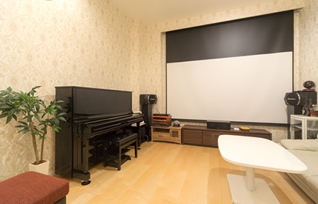 1階のシアタールーム。天井高3mの空間にある大きなスクリーンで、映画やコンサート映像を楽しまれているとか