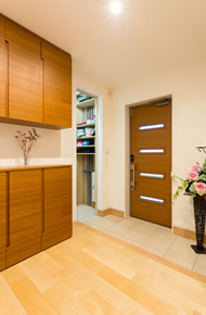 ショールームで気に入られたシューズクロークを設けた玄関。