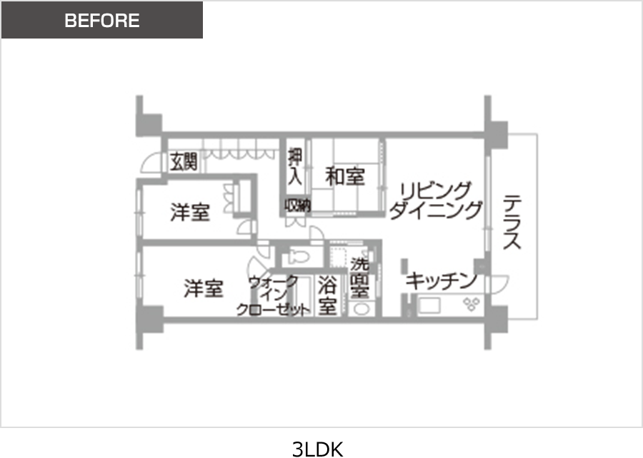 リフォーム前提で築浅の中古マンションを購入したI様。LDKのほかに洋室2間と和室がある、夫婦と子ども2人の世帯には使いやすい間取りでしたが、ご家族の希望で全面的な間取り変更を行いました。家族でゆったりと過ごせるよう、使わない和室を無くし、広く開放的なリビングを実現。廊下はできるだけ短くまっすぐにして、動線をシンプルに。自転車やスノーボードのお手入れができる、土間付きの趣味室も確保しました。ご家族が自分たちらしく暮らせる、こだわりの住まいの完成です。
