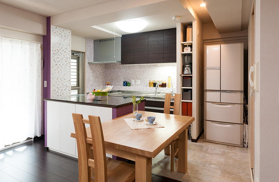 リビングとキッチンとの間にあったカップボードを撤去し、アイランドカウンターを設置。キッチンとリビングをつなげ、広々とした空間をつくり上げました。壁面にはモザイクタイルをあしらいアクセントに。