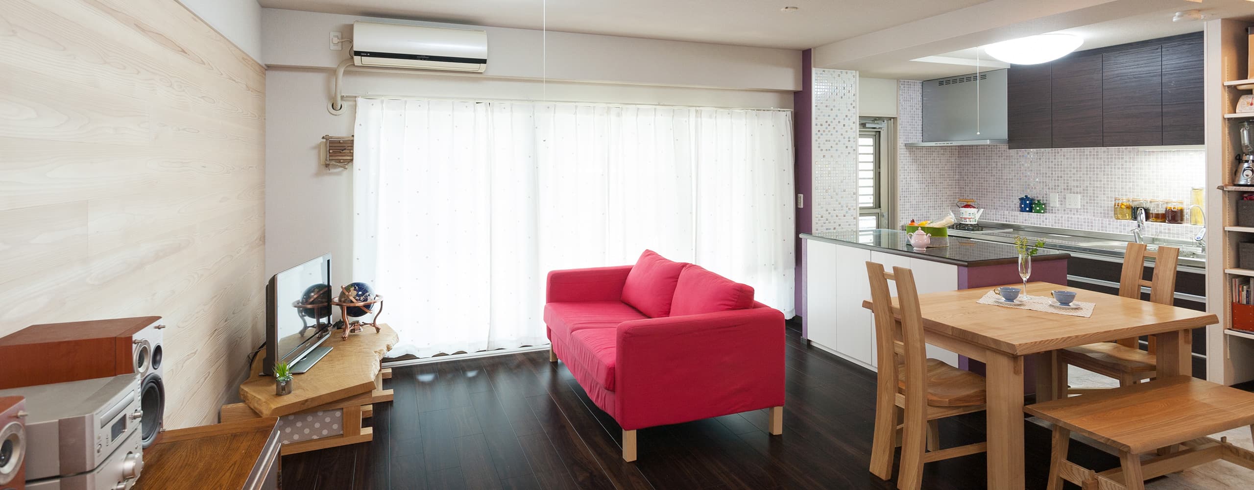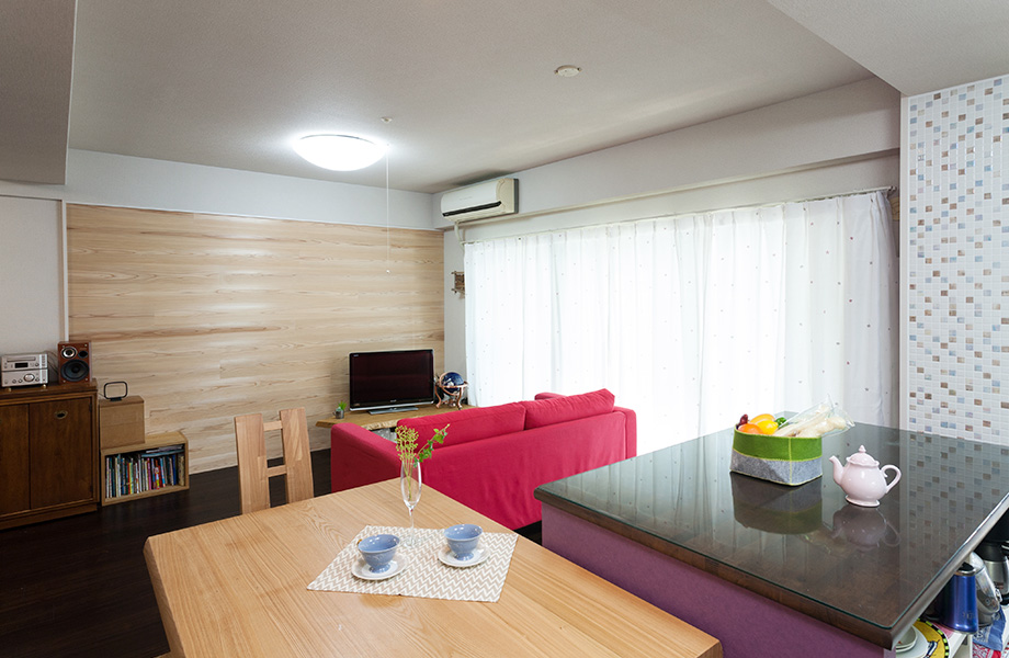 和室を無くしてLDKと一体化。家族でくつろげる大空間をつくるとともに、玄関からすぐにリビングに入れるシンプルな動線、というかねての希望も叶えました。壁の一部には吉野杉を貼り、ナチュラルな風合いをプラス。