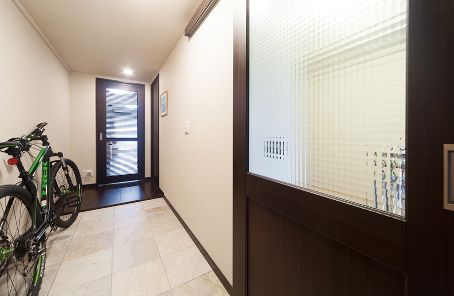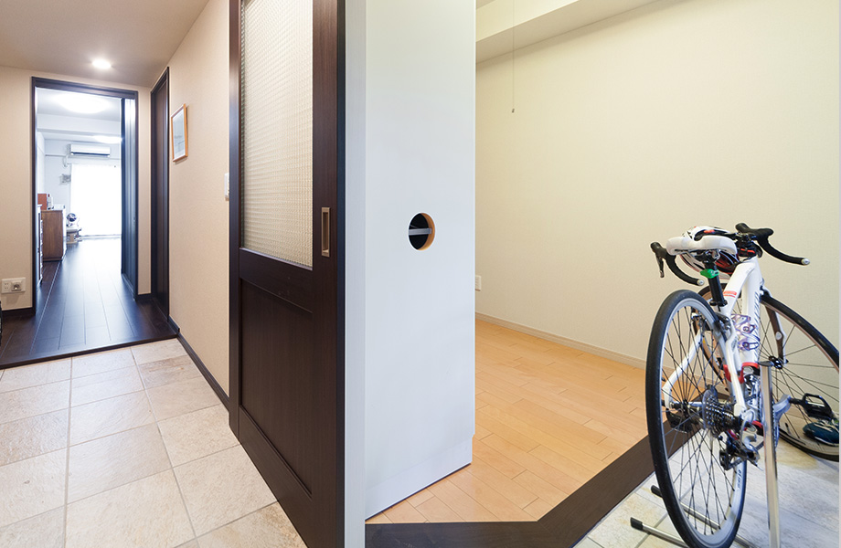 玄関横の洋室を玄関ホールの土間と一体化し、土間のある趣味室に。タイル貼りの土間では、趣味の自転車やスノーボードのお手入れも。