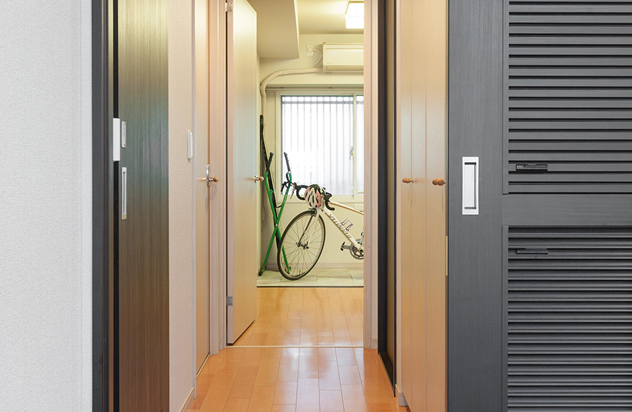 以前、廊下にあった、床から天井までの収納をすべて撤去。土間の部分をできるだけ大きく取って、自転車なども並べられるようにしました。