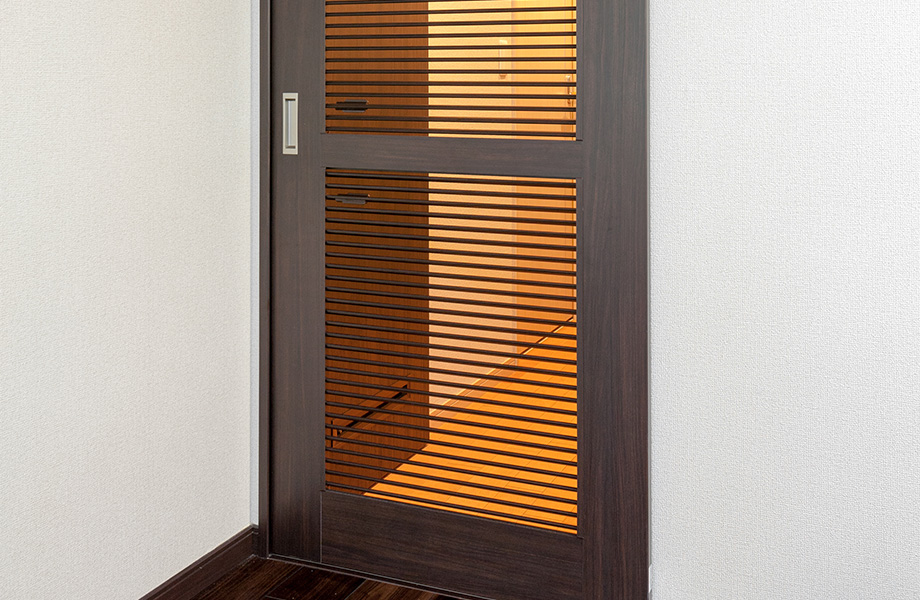 廊下を直線にするとともに、リビングとの間の引き戸をルーバー付きにすることで、プライバシーへの配慮と風通しを両立しました。
