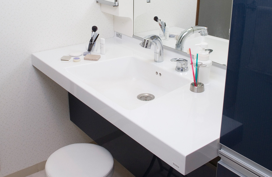 洗面所で化粧するために椅子に座れてミラーが大きく、照明のついた洗面化粧台をリクエストされました。
