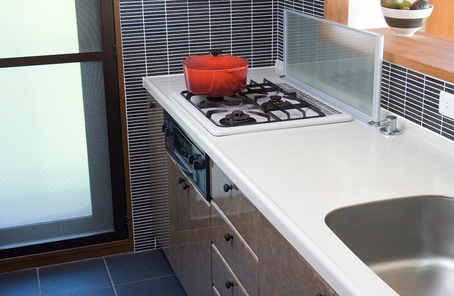 コンロ前の壁を無くした代わりにプレートを設置しました。壁面とキッチンの外観は同じスタイルで統一をしました。