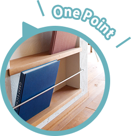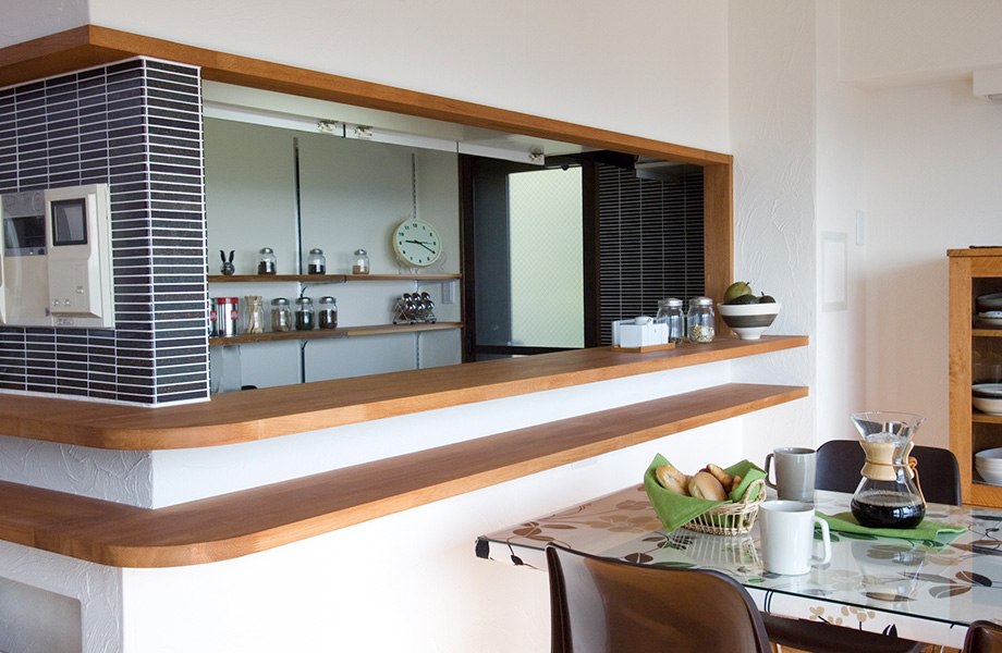 キッチン部分のカウンターは、シンクが見えない高さにして2段に。奥にある調味料棚は、Y様が日曜大工でつくった品です。空間を有効活用するため、カウンター脇の壁をくり抜きマガジンラックにしてあります。