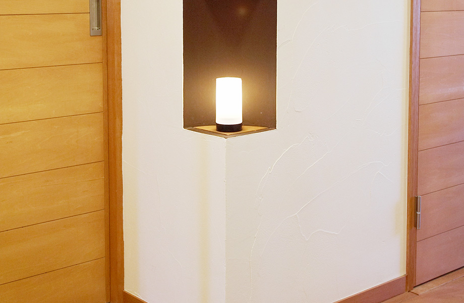 玄関の廊下の角をくり抜き、アロマライトで演出。光と香りのリラックス効果が楽しめます。スペースを有効活用して心地よい空間にしたいという、Y様のこだわりです。