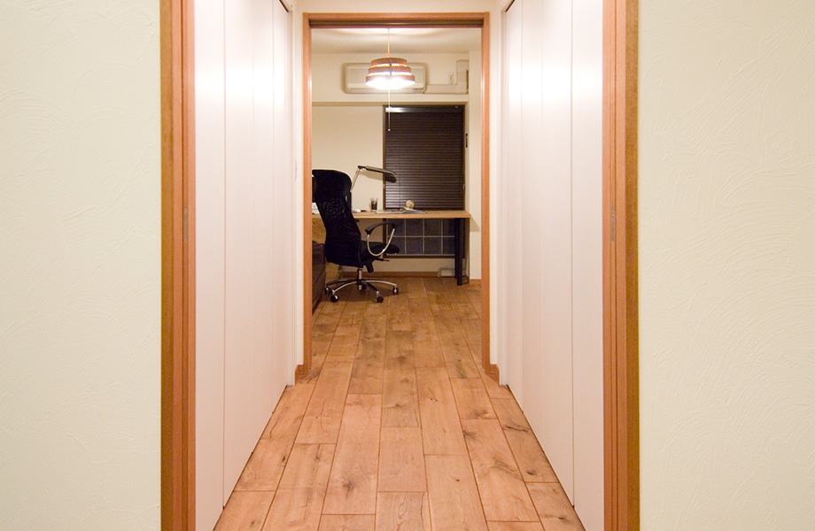 シックハウス症候群で悩んでいたY様ご夫婦。「中古マンションを買って、自分たちが快適に暮らせる『健康住宅』につくり変えられないか」と考えたのが、リフォームのきっかけでした。間取りも内装素材もごく普通の3LDKを購入し、床は無垢材に、壁や天井はクロスをはがしてオール珪藻土塗りに。光と風を通すために、間取りもリビングと玄関横の洋室を収納でつなぎ、開放的で心地よい住まいを実現。「この部屋に住んでから夫婦ともども体調がよくなり、我が家でくつろぐ時間がぐんと増えました」と、笑顔で語るY様です。