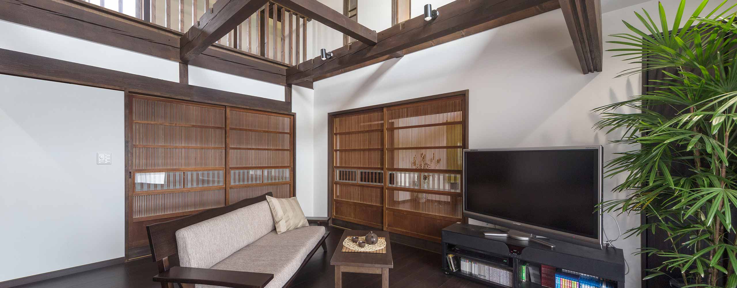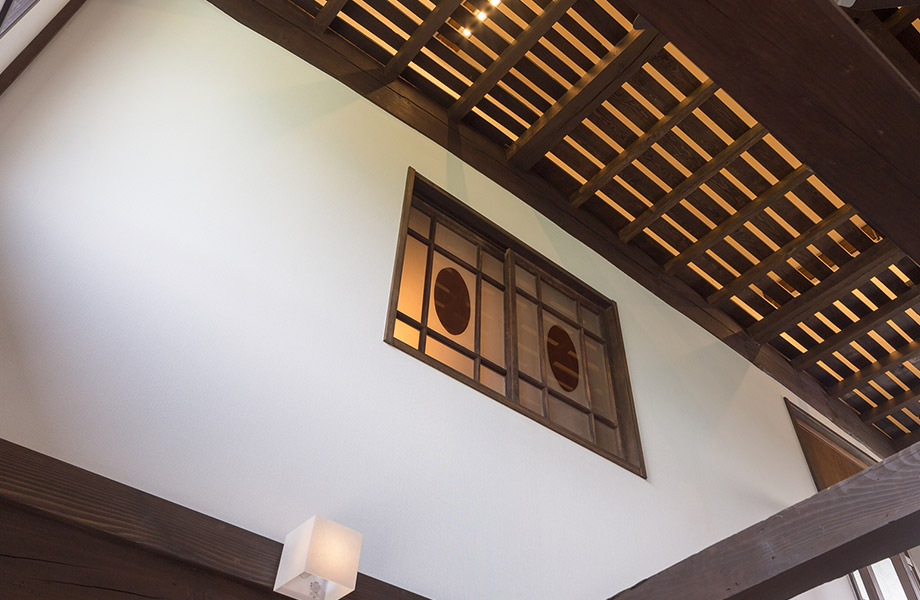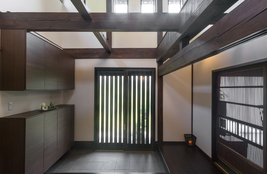 千本格子の建具、レトロな窓ガラス、書院や欄間の組子細工など、古い部材を活かして趣豊かな住空間に仕上げました。「解体して古いものが出てくると、大工さんが上手な再利用を提案してくれました」とO様。梁と柱はダークに塗装し、大黒柱を2階まで付け加えて通し柱に見せるなど、新旧を違和感なく調和させています。