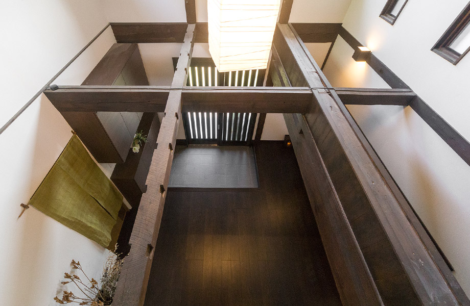 2階から玄関ホールを見下ろした眺め。吹き抜け空間に和紙のペンダント照明がしっくりと調和。縦横にわたる古梁が家の歴史と風格を感じさせます。