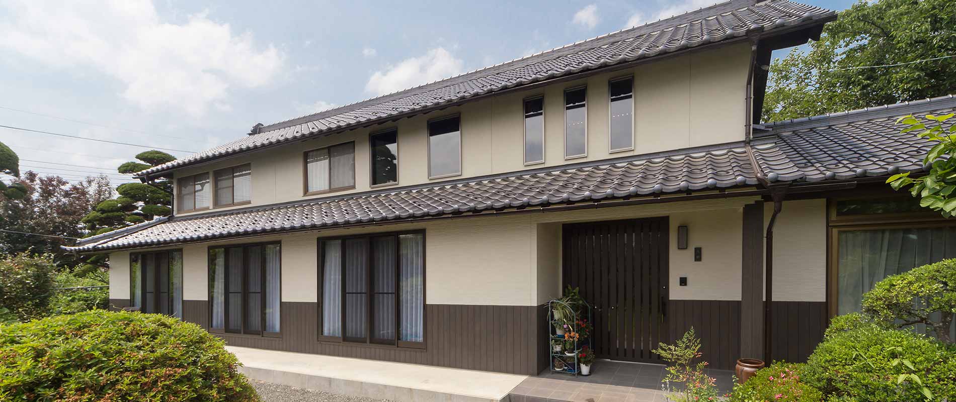 1階部分にサイディングを張り、2階部分は再塗装をして美しく蘇らせた外観。腰壁を配した外壁で落ち着いた佇まいになりました。グレータイル床の玄関ポーチに、木調格子デザインの玄関引き戸が調和。屋根は瓦の土を除去して軽くし、耐震壁をバランスよく配して耐震性も向上させました。