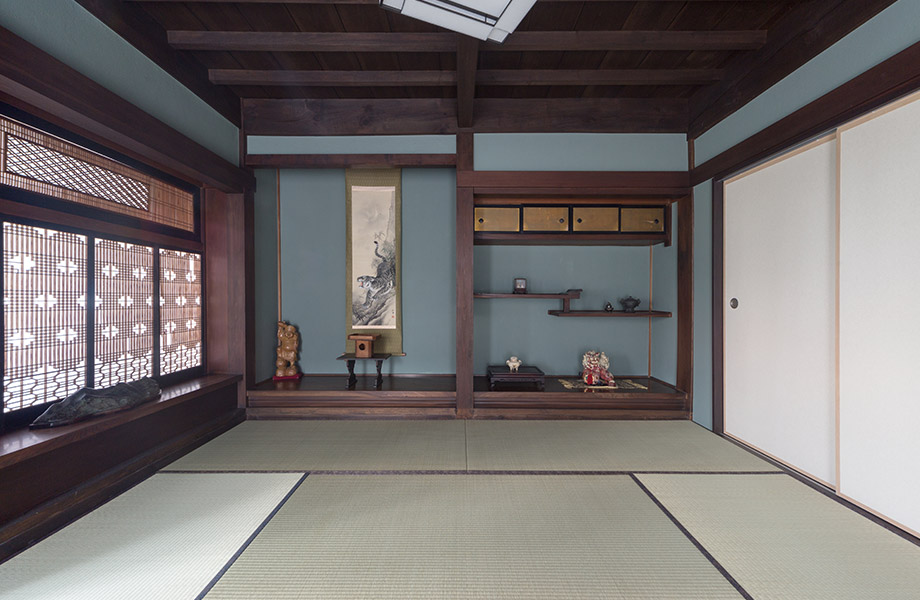 趣豊かな奥の本格和室は、既存のしつらえを大事に生かして再生しました。傾いていた柱は両脇を化粧部材で固めて太くし、まっすぐに補強。壁を灰味のある淡い青色で再塗装し、見事な組子細工の書院の欄間や障子は洗ってきれいに蘇らせています。