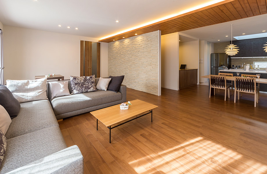 空き家になっていたご実家をリフォームし、マンションから移り住まれたH様。以前はリビング、ダイニング、キッチンが仕切られていたため薄暗い雰囲気で、洋館風のクラシックな内装も好みに合わなかったとのこと。そこで壁を撤去してLDKをオープンにつなげ、無垢材の下がり天井や石目タイル壁、間接照明を採り入れて、木の温もり漂うナチュラルモダンなインテリアに演出しました。また、収納を低めの位置に集め、視線の広がりを意識した空間を構成すると共に、モノが見えないすっきりとした暮らしを実現しています。「明るさも広がりも見違えるよう。家族がいつもふれあえ、友人も大勢招いて楽しめる家になりました」と笑顔で語るH様です。