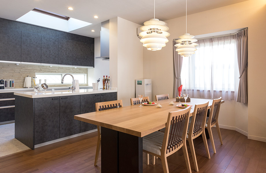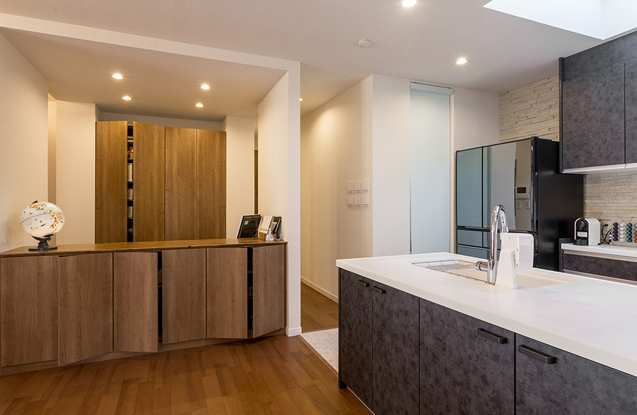ダイニングテーブルの上には、ルイス・ポールセンのペンダント照明「スノボール」を2つ設置。黒のセラミック調のカウンターキッチンがシックな家具のように映え、天窓から光が明るく差し込みます。キッチンはダイニング側も豊富な収納になっていて、ここにグラスやカップ類がすっきりとおさまっています。「テーブルからも取り出しやすくて便利です」とお喜びのH様。