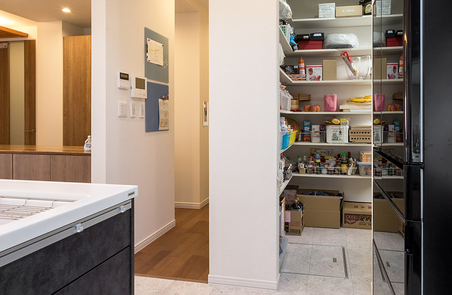 キッチン横からオープンな開口でパントリーへとつながる。パントリーにはL字の棚を造作し、保存食品やストック類などをたっぷりと収納。ここに勝手口も設けています。ロールスクリーンを下ろすと目隠しできるのですっきりした空間となります。