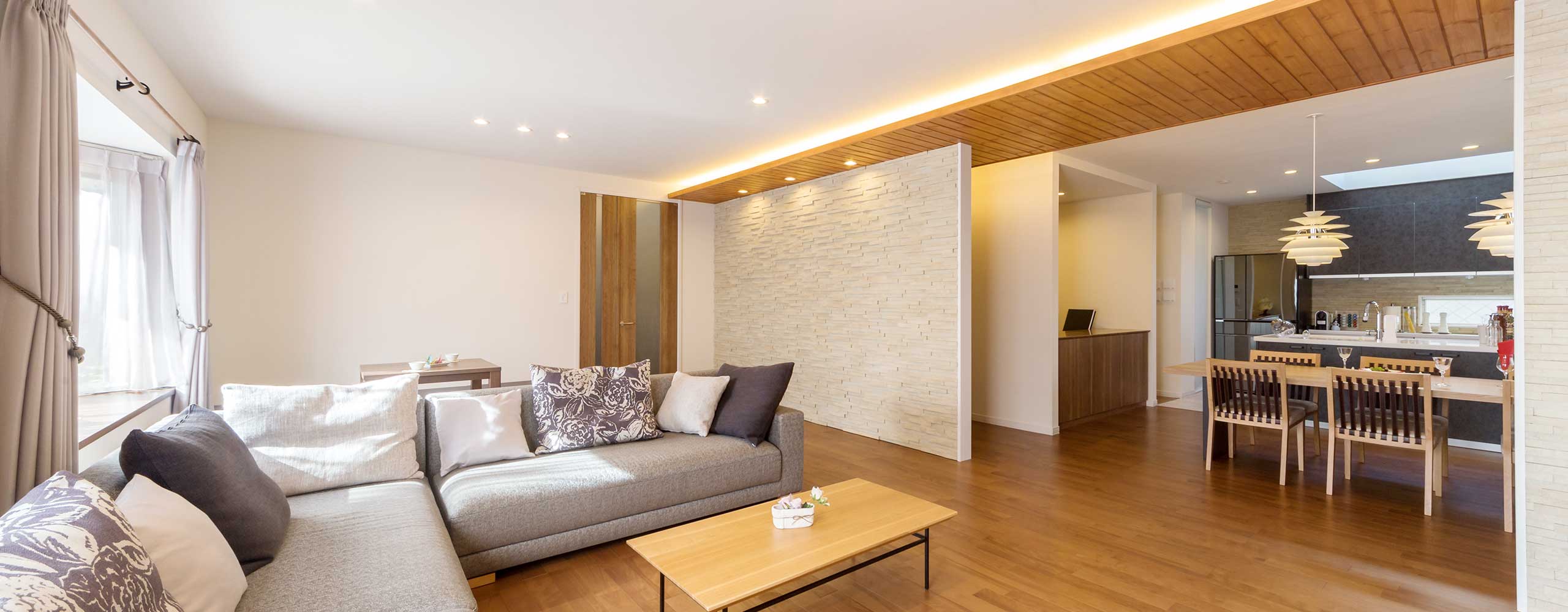 明るくモダンな雰囲気に生まれ変わったくつろぎ空間。間仕切り壁を取り払い、LDKをひと繋がりのオープン空間に。リビングはダイニング側の壁を割り肌の石目ボーダータイル貼りにし、上に無垢材パネルの下がり天井を配しました。間接照明も組み込んで、やさしい灯りで木の温もりと気品を演出しています。