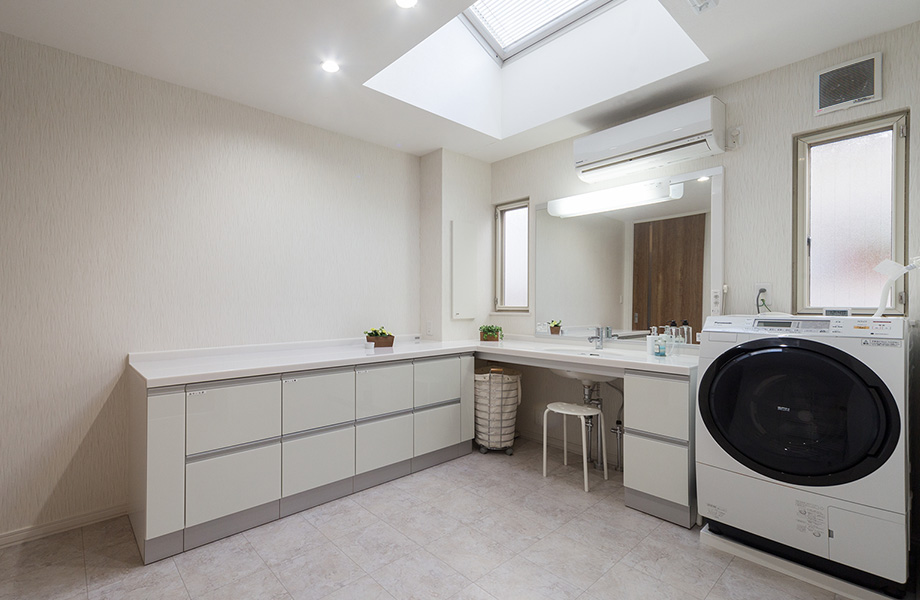広い洗面所は白で明るくすっきりと統一し、カウンター収納と洗面化粧台をL字に造作。引き出しを家族別に分けて、それぞれに収納。お子さま達は制服もここに入れて、朝や帰宅時の着替えが洗面室でできるようにしている。カウンターでアイロンがけもできて便利。室内物干しも設置して、雨の日も洗濯物が干せるようにしました。