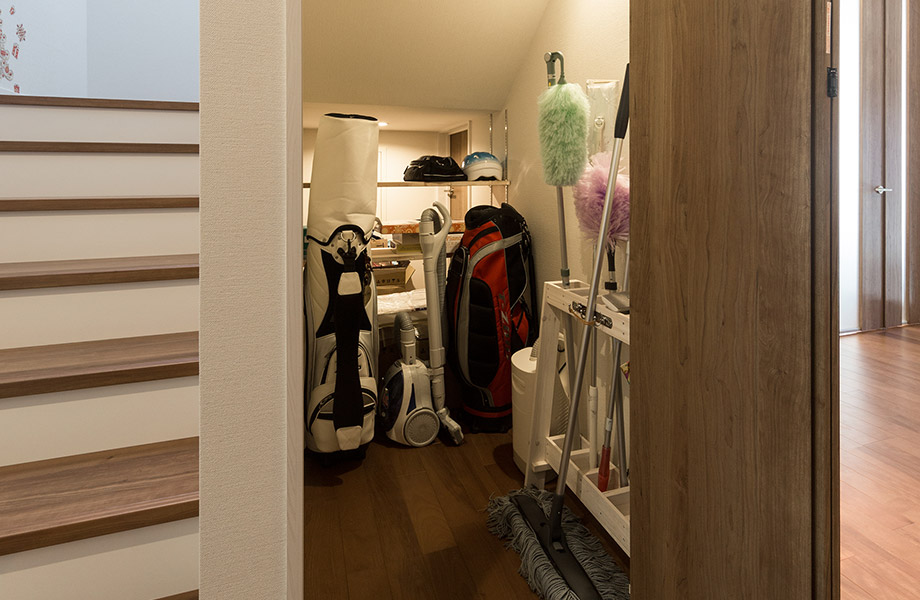 玄関ホールに、階段下を有効利用して広い収納スペースを新設。ゴルフバッグなどかさばるものや掃除道具もここに収納しています。玄関ホール側と廊下側の2ヵ所から出入りできる2ウェイの動線も便利です。