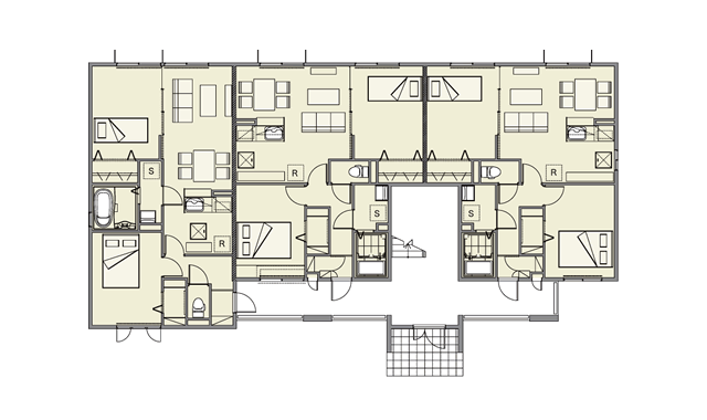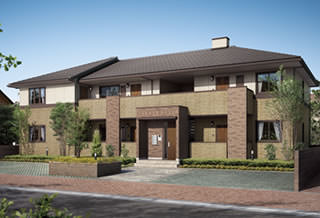 ハイウェストボーダーにより水平ラインを強調した、ゆったり根を張るような風格ある佇まいが魅力。また廊下上部に張り出した庇で陰影感を表現。アクセントウォールは単調になりがちな廊下面のファサードに変化を与えています。