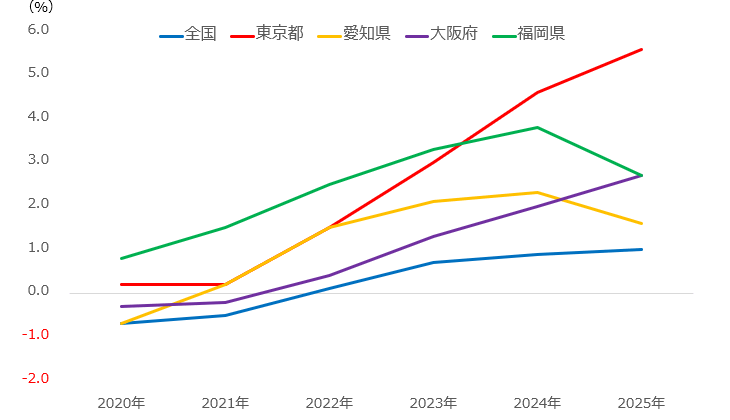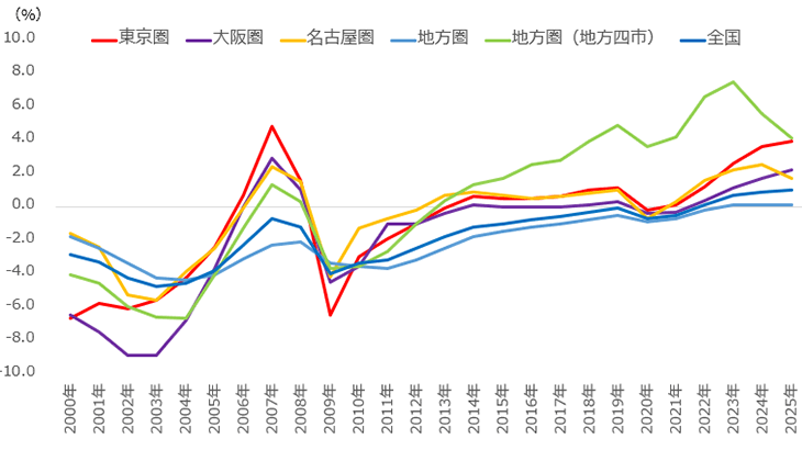 その一方で、地方四市を除く、「その他地方圏」では、±0.0%となり、30年ぶりにマイナス圏を脱しました。ちなみに、過去5年をみれば、2024年は-0.1%、2023年は-0.2%、2022年は-0.5%、2021年は-0.8%で順調に回復した足取りが伺えます。