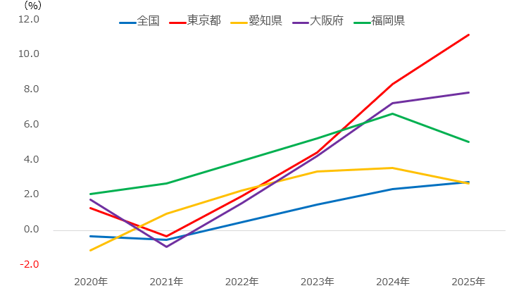 2位は大阪府で+7.9%(昨年は7.3%)。万博開催などを契機にインバウンド観光客と国内観光客が大幅に増加、またJR大阪駅北側の「グラングリーン大阪」がオープンと、梅田エリアの再開発が進んでいます。3位は沖縄県で+7.1%(昨年は+6.1%)、4位は神奈川県でプラス7.0%(昨年は+6.2%)、5位は京都府でプラ+ス5.7%(昨年もつ5.7%)となりました。沖縄と京都は引き続き観光需要が活況であることが大きな要因となっていると思われます。