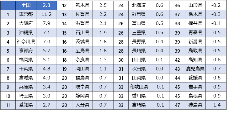 2位は昨年と同じく東京都で+5.6%(昨年は4.6%)、3位は千葉県と神奈川県で+3.3%(両県とも昨年は4位で+3.2%)5位は大阪府で+2.7%でした。
