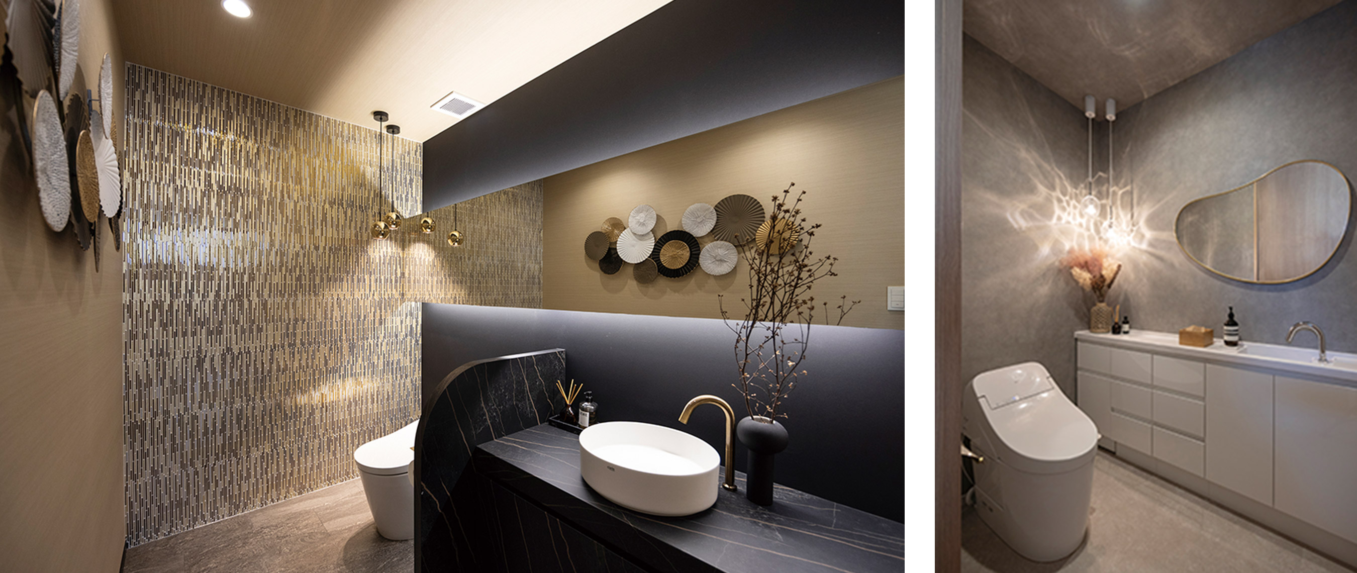Dさんの好みを生かしたおもてなしトイレ(左)は、1階のパブリックエリアに。艶のあるアクセントタイルや間接照明、黒とゴールドを配したゴージャスな空間です。一方、2階のトイレ(右)はSさん好みのジャパンディなコーディネート。小空間にお二人の個性が際立ちます。