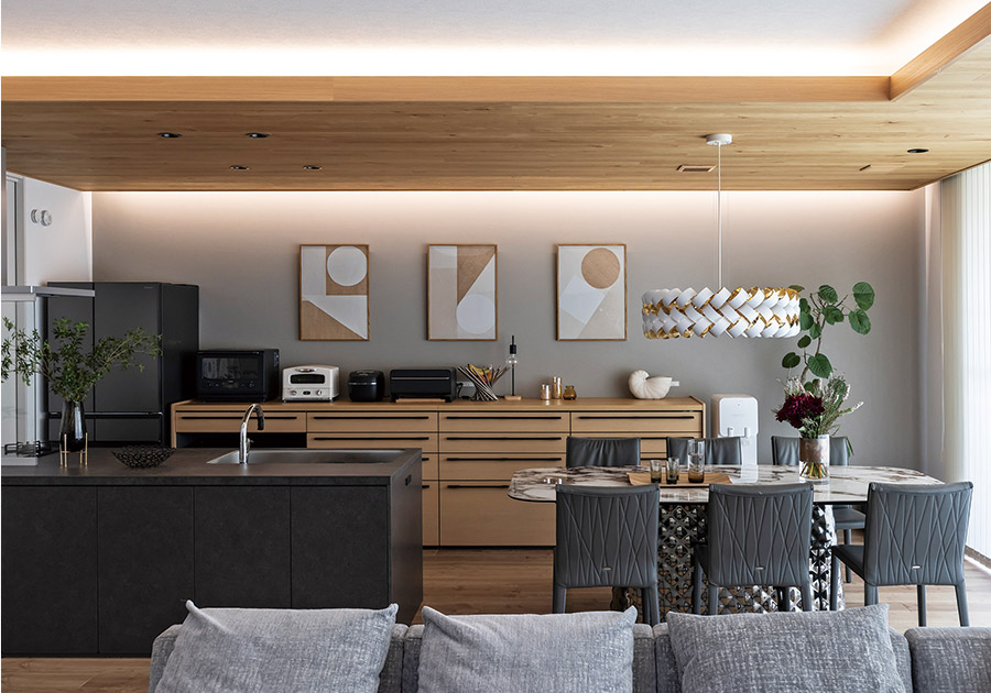 広いLDKが単調にならないように、木目の下がり天井をあしらい、間接照明を埋め込んで変化をつけました。時間帯やシーンによってさまざまな表情を演出することができます。