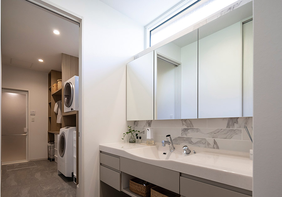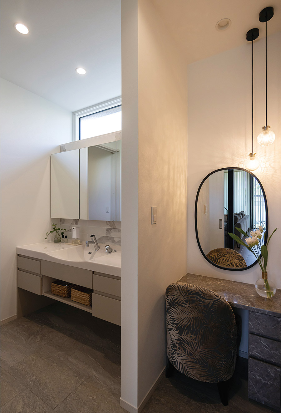 水回り動線の一角に造作のドレッサーを設置しました。「どこに設けるか迷いましたが、キッチンの近くで正解でした」とSさん。家事の合間にご自身のお手入れができると、喜んでいらっしゃいます。
