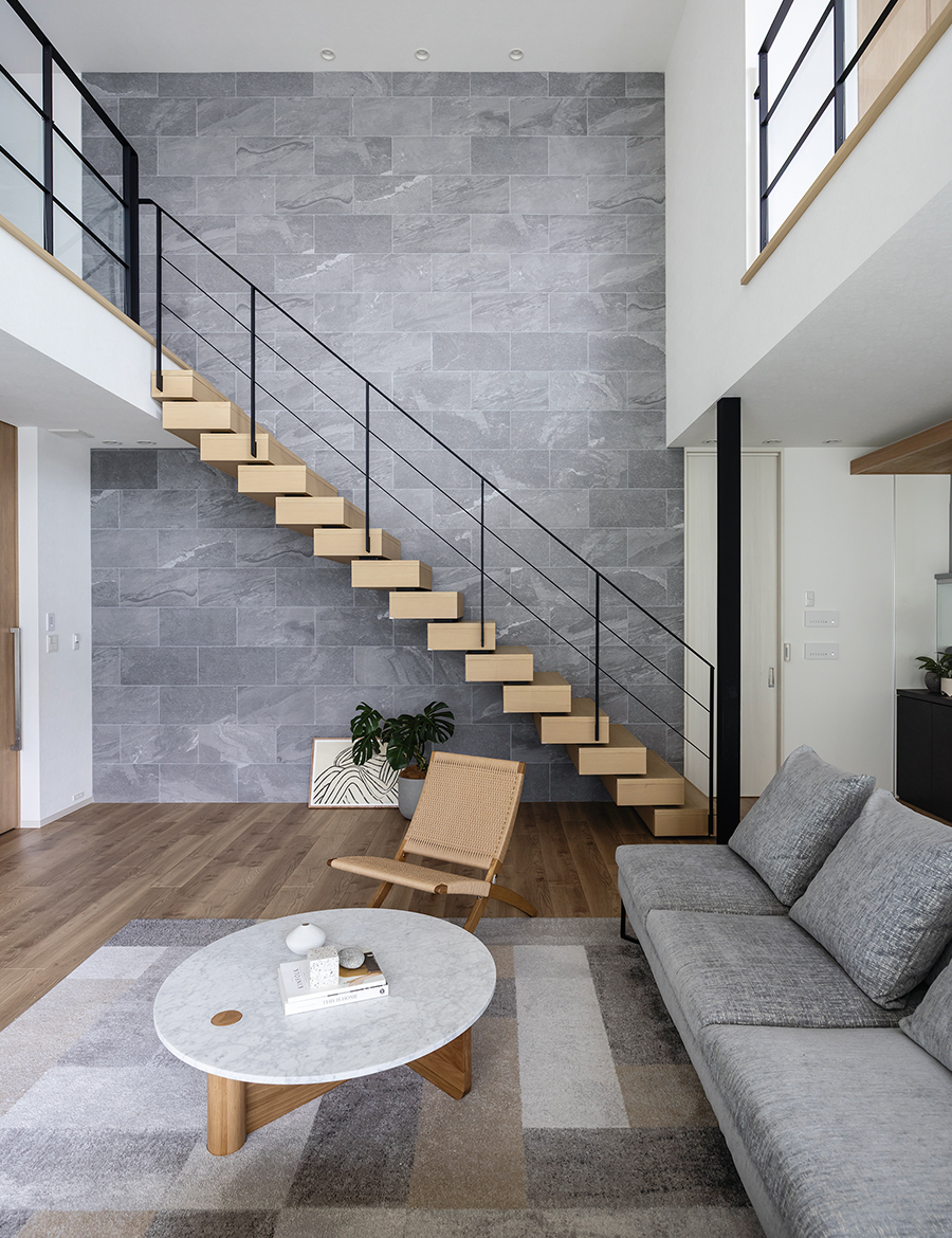 SNSを参考にオーダーされた箱状の階段。木の箱が浮いているように見える不思議なデザインです。広いLDKの壁面を飾るオブジェのような存在にもなっています。