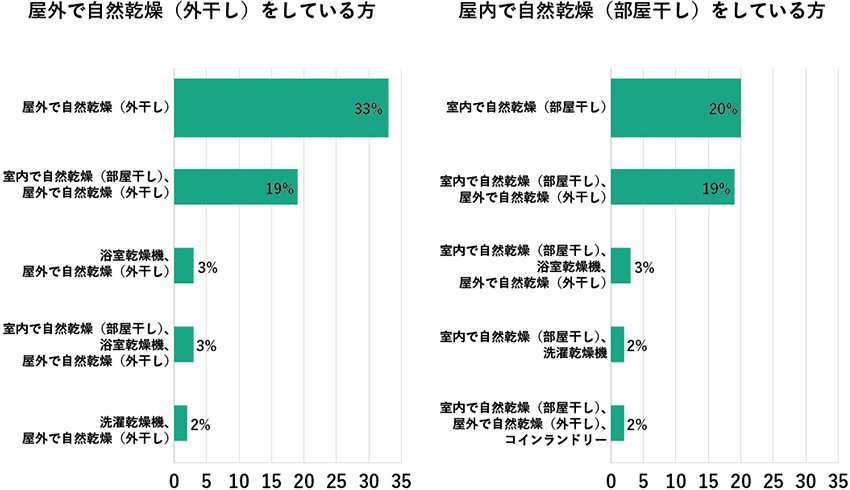 続いて、洗濯物の乾かし方に関する実態を伺うと、最も多かったのは「屋外で自然乾燥(外干し)」(33%)で、次いで「室内で自然乾燥(部屋干し)」(20%)となりました。