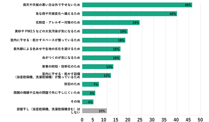 部屋干しをする理由を聞いてみると、前述でも触れた通り最大の理由はやはり「天候」でした。「雨天や天候の悪い日は外で干せないため」(46%)、「急な雨や天候変化に備えるため」(40%)と、半数近くが天気に左右されて部屋干しを選んでいることがわかります。