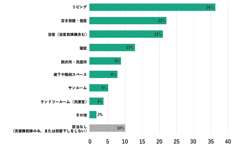 部屋干しをする際の場所として最も多かったのが「リビング」(36%)。広い空間で、エアコンやサーキュレーターを使えば乾きやすく、生活の中心にある使い勝手の良さも理由のひとつでしょう。次いで多かったのが「空き部屋・個室」(22%)。来客時でも目立たず、生活空間と切り分けられる快適さがあります。