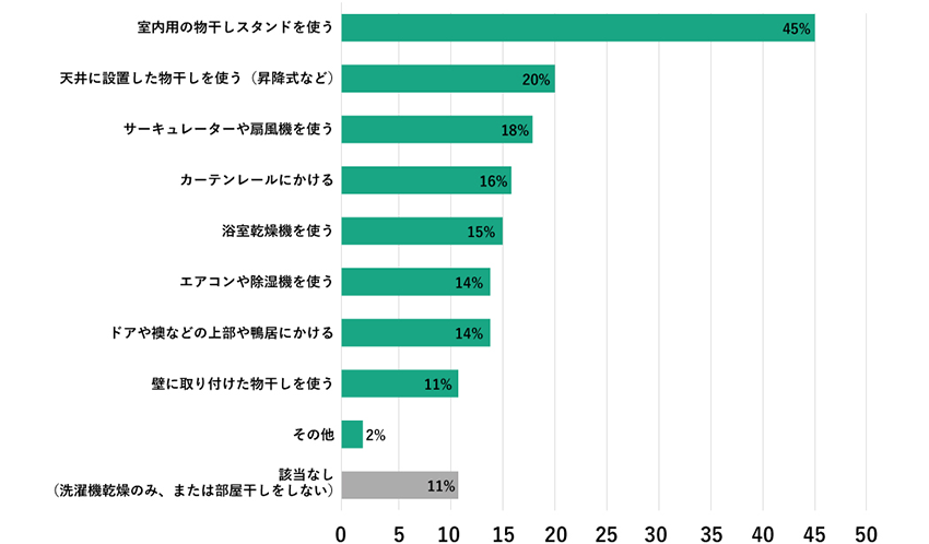 では、具体的にどのような手段で部屋干しをしているのでしょうか。最も多かったのが「室内用の物干しスタンドを使う」(45%)です。場所を問わず設置でき、使わないときには折り畳んで片付けられる手軽さが魅力です。ただし、生活空間を圧迫しやすく、室内が散らかった印象になりやすいという課題もあります。