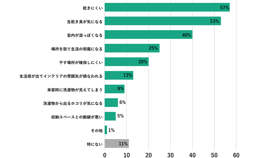 部屋干しで多く挙げられた悩みは、「乾きにくい」(57%)、「生乾き臭が気になる」(53%)、「室内が湿っぽくなる」(40%)で、4割以上がこうした不便を感じています。