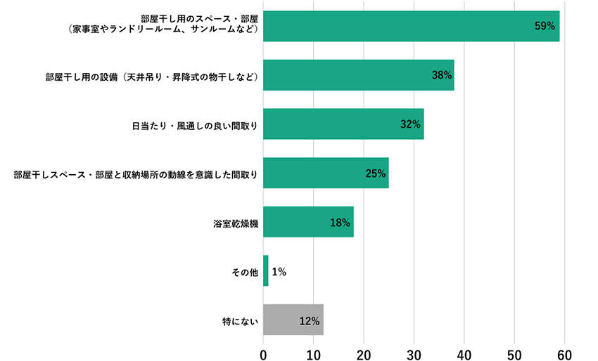 これまでの設問を踏まえ、住まいづくりを計画する際に、部屋干しを快適に行うために取り入れたい設備や工夫についてご意見を伺いました。結果は、全体の6割近くが「部屋干し用のスペース・部屋(家事室やランドリールーム、サンルームなど)」(59%)を希望しており、専用スペースのニーズが高いことが明らかになりました。いまや部屋干しは日常の洗濯スタイルのひとつ。快適に行うための環境づくりは欠かせません。