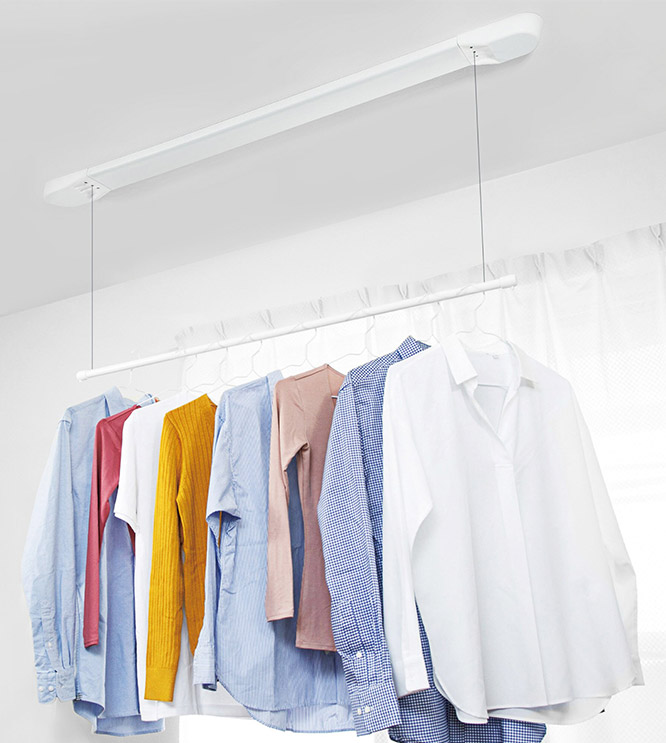- 3階のベランダまで干しに行くのは大変なので、リビングに吊り下げ式の物干しが欲しい。エアコンの風を活用すれば、省エネ&加湿にもなりそう