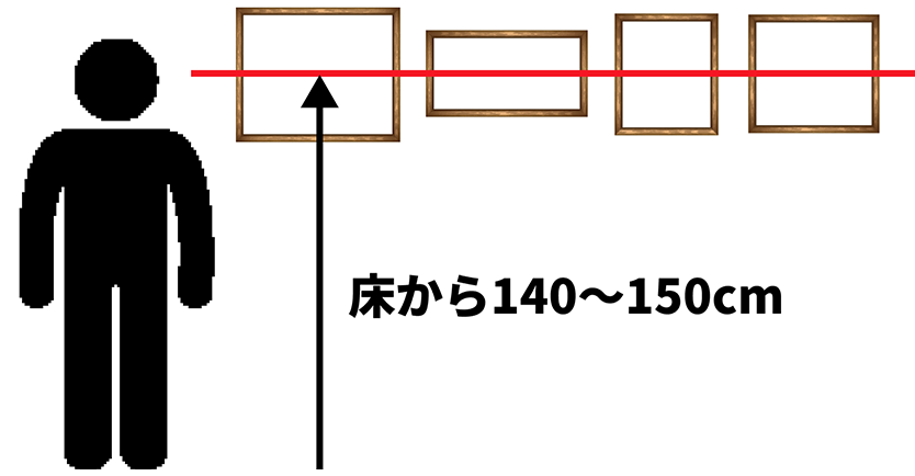 壁などに絵を掛けるときは、一般的に絵の中心が床から140〜150cmの高さ、大人が立ったときの目線と同じくらいに合わせると見やすく、部屋の中で収まり良く見えるとされています。これは美術館や画廊などでもよく使われている高さです。