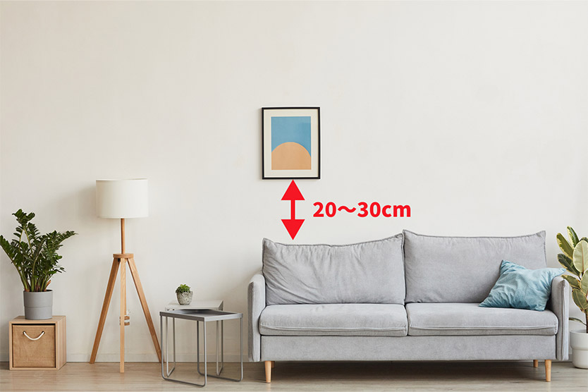 しかし、美術館や画廊とは違い、自宅のリビングや寝室には壁の近くにソファやテーブルなどの家具が置かれることもしばしば。その場合は、天井の高さや家具の高さにもよりますが、例えばソファであれば、上部から20〜30cmくらい上の位置に絵の下部が接するように掛けると、ソファとのバランスがとれて全体がまとまり良く見えることが多いです。