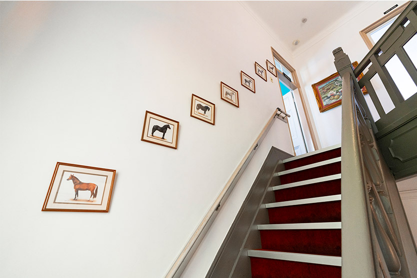 絵を階段の壁に飾るときは絵が自然と目に入るよう、階段の角度に合わせて、斜めのラインに沿うように配置するといいでしょう。大きさが違う絵も同じフレームで統一すると、全体が調和した空間になります。