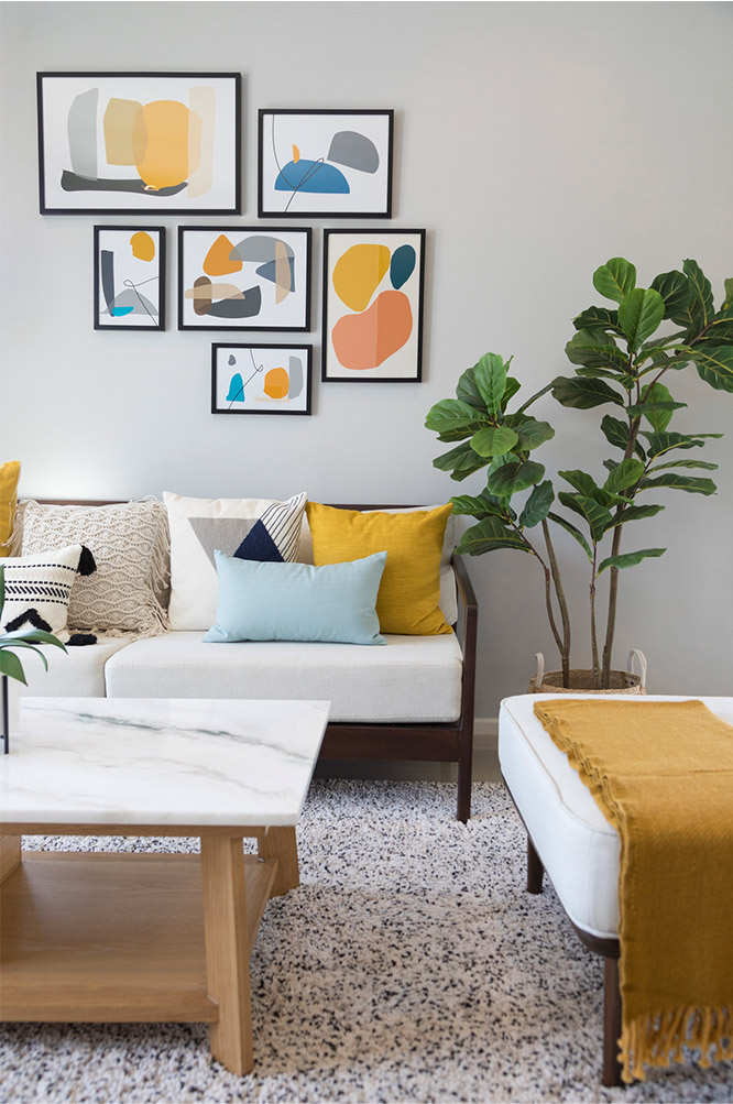 いろいろな大きさの絵をアシンメトリーに配置すれば、動きが感じられます。上下の絵の間を中心線にして、絵の額縁の端をそろえることで、全体のまとまり感も演出できます。