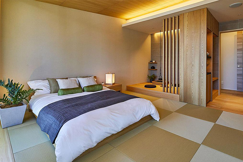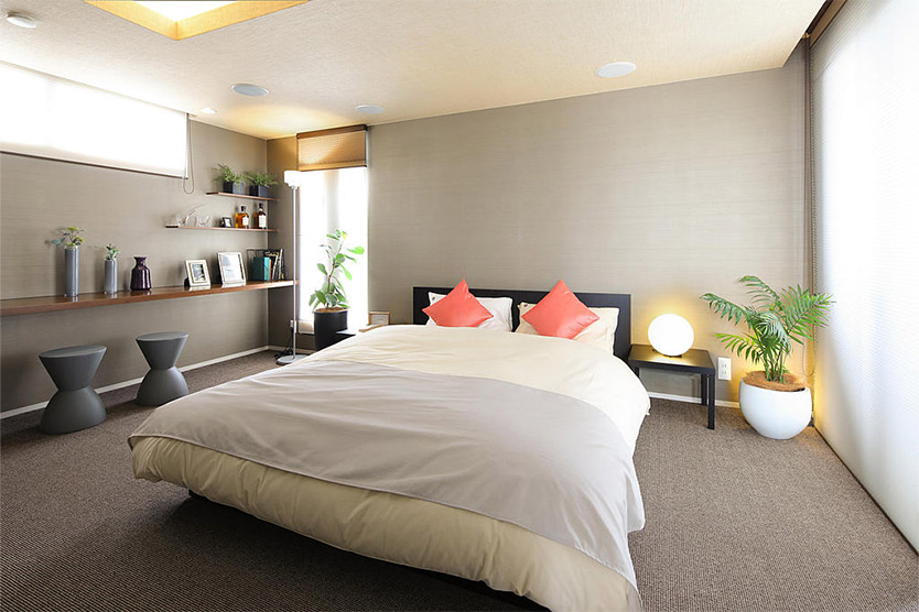 イ草を使用したタタミを敷き、高さを抑えたローベッドや、和紙を使った照明器具でコーディネートすることで、スタイリッシュな和を感じる寝室にできます。自然素材の木や竹などは、見た目の印象だけでなく、手や足で触れたときの質感の良さが魅力です。天然イ草のタタミには、調湿や消臭の働きがあり、リラックス効果があるといわれています。