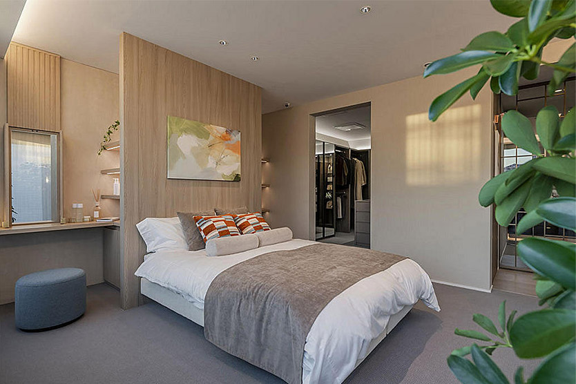 あまり物を置かずに生活感を抑え、インテリアに統一感を持たせることで、ホテルのように居心地の良い寝室にすることができます。タイルの質感と間接照明を生かしたアクセントウォール、毛足の長いカーペット、上質な素材のベッドスプレッドやベッドスローなどの寝具が、空間を魅力的に演出します。ホテルはカーペット敷きが多い印象がありますが、ホコリが舞いにくいのでアレルギー対策になるなどのメリットがあるようです。