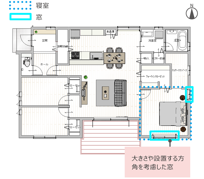リラックスして快眠できる寝室にするためには、室内の明るさ、静かさ、温度などをちょうど良い状態にする必要があります。外から入ってくる、光、外気、音などを調整するために、窓の方角や大きさは重要なポイントになります。