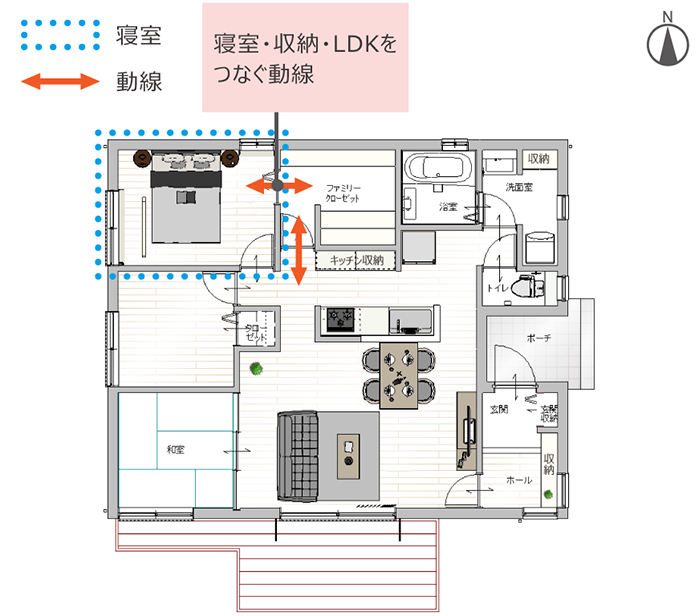 上の平屋の間取りプランでは、来客の目に触れにくいプライベート空間である寝室に、昇降式の室内物干しを設置し、エアコンの除湿機能などを使って洗濯物を室内干しできるように工夫。寝室隣のファミリークローゼットとつながる、「洗濯する→干す→たたむ→しまう」が便利な家事動線も実現しています。布団や家族の衣類もまとめてしまえて、ほかの部屋を広く使えます。