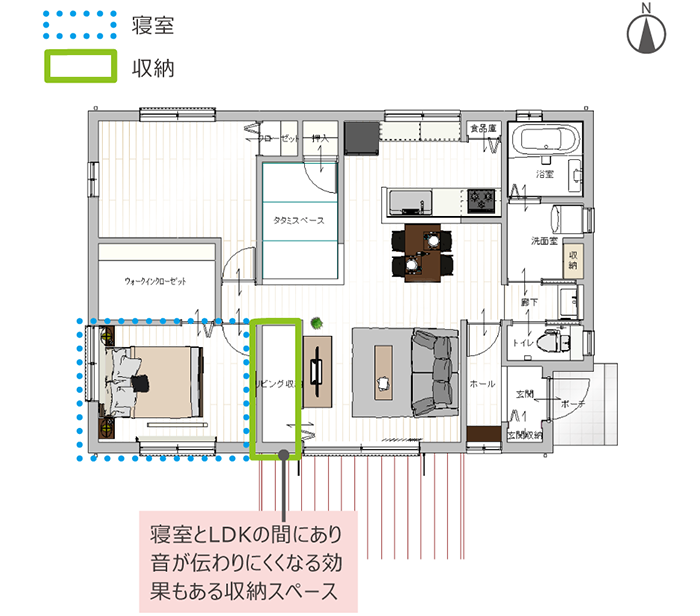 上の平屋の間取りプランでは、寝室と隣の部屋の間に、奥行きのある収納スペースを設けることで、音が伝わりにくくなるよう工夫しています。