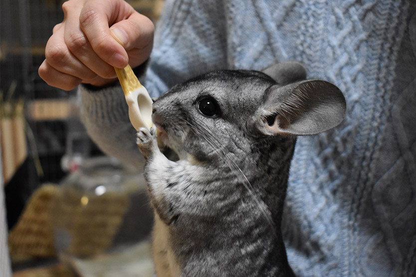 野生のチンチラは土地が荒れた、植物が少ない地域に生息しています。そのため栄養価の低い植物の葉や根などからでも栄養を吸収できる体になっています。良かれと思って、水分が多く栄養価の高い生野菜や果物を与えると、肥満や病気の原因になる可能性があります。食事は1日1回、夕方から夜の時間帯にチンチラ用のペレット(固形フード)を主食として与えます。また、乾燥した牧草を床材として敷いておき、いつでも食べられるようにします。食べ残したエサは捨て、毎回新しいものに替えてください。
